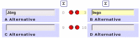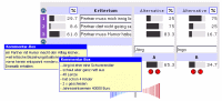 Zur Bewertung wird eine Skala herangezogen mit einer Bandbreite von 1 bis 9 bzw. 1 bis 1/9 Punkten. Für die Praxis kann man sich die Bewertung am besten in Form eines virtuellen Schieberregler (grauer Querbalken) vorstellen ähnlich einem Lautstärkeregler. Dazu wird oben in der Beispielsgrafik das Kriterium Nr. 1 (oberhalb) dem Kriterium Nr. 2 (unterhalb) gegenübergstellt, verglichen und mit einem Punktzahl intuitiv bewertet. Alternativen vergleichen + bewerten Im sechsten Schritt muß der Entscheider seine Alternativen auf ihrer Eignung hin untersuchen und bewerten. Dabei stellt er jeweils zwei Alternativen gegenüber und bewertet welche Alternative am besten zur Erfüllung des jeweiligen Kriteriums passt. Beispiel  ( Bitte per Mausklick vergrößern)