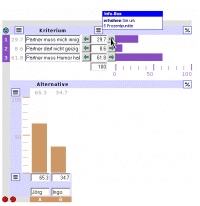 Die Stabilität der Entscheidung Mit Hilfe einer Stabilitäts-Analyse (Sensitivitäts-Analyse) erkennen man wie stabil die Lösung bleibt, wenn Sie an den Prozentwerten Ihrer Kriterien (blaue Balken) nachträglich willkürlich etwas verändern würden, die Sie ja ursprünglich sehr exakt durch paarweise Vergleiche in Schritt 5 ermittelt hatten. durch schrittweise Veränderung der Kriterien Wenn Sie schrittweise die Prozentwerte (blaue Balken) mit Hilfe der Pfeiltasten links /rechts verändern, können Sie die Auswirkungen auf die Rangfolge Ihrer Alternativen (rote Balken) beobachten dazu Erläuterung: Wenn Sie diesen Test an allen Kriterien durchführen, werden Sie feststellen, daß ein "Umkippen" der Rangfolge (50 % zu 50%) bei manchen der Kriterien überhaupt nicht möglich. Selbst wenn Sie die Prozentwerte extrem auf 0 % oder 100 % willkürlich verändern, bleibt die Rangfolge Ihrer Alternativen trotzdem absolut stabil. durch Darstellung in Linienform Über Linien läßt sich für jedes einzelne Kriterium die gleichen Aussagewi oben in einer anderen Form darstellen. Auswertung Beispiel  ( Bitte per Mausklick vergrößern)