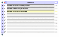 dazu Erläuterung: Team-Moderator ist der "teamchef". Die Sitzplätze um den Tisch besetzt er mit den Team-Mitglieder "teamwork01" bis "teamwork06". Das Team-Thema definiert er mit dem Team-Namen "lkw_sob" Gesichtspunkte bzw. Kriterien Im dritten Schritt benennt der Entscheider unsortiert alle Kriterien (Gesichtspunkte), die für ihn zur Lösung der Fragestellung als wichtig erscheinen. Die Sammlung erfolgt häufig im Wege eines vorangegangenen Brainstorming Beispiel:  ( Bitte per Mausklick vergrößern)