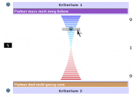 Betrachten Sie den waagerechten Abstand von der blauen senkrechten Linie des jeweiligen Kriteriums z.B. "Partner muß mich innig lieben" zu dem Schnittpunkt mit den roten Linien der Alternativen z.B. " Jörg" und "Ingo". Dieser Schnittpunkt zeigt genau die Stelle, an der die Rangfolge der beiden Alternativen "umkippt" bzw. sie ihre Plätze miteinander tauschen. Genau an dieser Stelle können Sie dann über den Abstand ablesen, um wieviel Prozentpunkte Sie Ihre jeweiliges Kriterium manipulieren müssten, damit die Rangfolge umkippt.Hierbei gelten für die Lage bzw. Abstand der Schnittpunkte zur blauen Linie und der damit verbundenen Aussage über die Stabilität der Rangfolge folgende Vereinbarungen