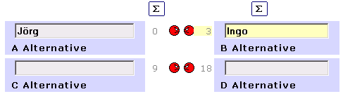 Damit ist die erste Phase des Sammelns und Formulierens aller entscheidungserheblichen Daten abgeschlossen. 2. Phase: Daten vergleichen und gewichten Nach der ersten Phase des Sammlens und Formulierens folgt nun die Gegenüberstellung, Vergleich und Bwertung aller Kriterien bzw. Alternativen in zwei Unterschritten: Kriterium vergleichen + bewerten Im fünften Schritt muss der Entscheider jedes Kriterium jedem anderen gegenübergestellen und vergleichen. Hierbei notiert der Entscheider, welches jeweils der beiden Kriterien für ihn wichtiger erscheint. Durch diese Methode der paarweisen Vergleiche läßt sich eine sehr genaue Bewertung aus der Vielzahl konkurrierender Kriterien dem Entscheider "entlocken". Beispiel  ( Bitte per Mausklick vergrößern)