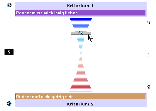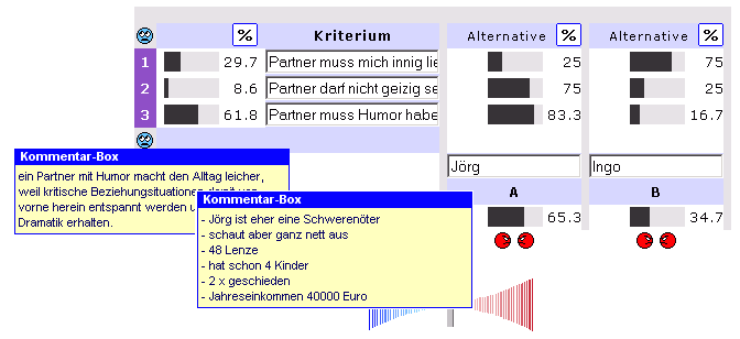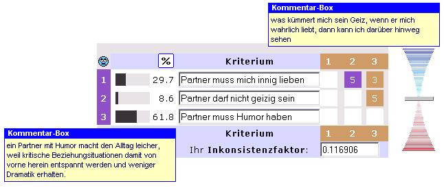Zur Bewertung wird ebenfalls eine Skala herangezogen mit einer Bandbreite von 1 bis 9 bzw. 1 bis 1/9 Punkten. Für die Praxis läßt sich die Bewertung am besten in Form eines virtuellen Schiebers erklären ähnlich einem Lautstärkeregler. Dazu wird oben in der Beispielsgrafik die Alternative Nr. A (links) der Alternative Nr. B (rechts) gegenübergstellt, verglichen und mit einem Punktzahl intuitiv bewertet bezogen auf das Kriterium Nr. 1 (oberhalb). 3. Phase: Daten verarbeiten im siebten und letzten Schritt steht die Beantwortung der zu Anfang gestellten Frage. Dazu gibt es nach Thomas Saaty eine Reihe von Auswertungsszenarien. Die wichtigsten werden hier erläutert Lösungen Rangfolge und Gewichte der Kriterien dazu Erläuterung: Aus den einzelnen Bewertungen des Entscheiders von Schritt 5 ermittelt der AHP nach einem mathematischen Modell (siehe unten Weblinks "AHP Einführung") eine recht präzise Gewichtung aller Kriterien und fügt diese in eine prozentuale Reihenfolge zusammen. Sieger und wichtigstes Kriterium (Gesichtspunkt) für diesen Entscheider war "mein Partner muß Humor haben" mit 61,8 Prozentpunkten Rangfolge und Gewichte der Alternativen im Vergleich zu den Kriterien dazu Erläuterung: Aus den einzelnen Bewertungen des Entscheiders von Schritt 6 plus 5 ermittelt der AHP nach seinem Modell auch eine recht präzise Gewichtung aller Alternativen in Bezug zu den jeweiligen Kriterien und fügt diese in eine prozentuale Reihenfolge zusammen. In der Grafik oberhalb zeigt die prozentualen Gewichte, wie gut die Alternativen das jeweilige Kriterium nach Meinung des Entscheiders erfüllen. Sieger und beste Alternative (Lösungsvorschlag) für diesen Entscheider war "Partner Jörg" mit 65,3 Prozentpunkten Inkonsistenzfaktor Der AHP misst bei dieser Gelegenheit über den sogenannten Inkonsistenzfaktor die Logik der Bewertungen zueinander. Damit steht eine Aussage über die Qualität der ermittelten Entscheidung zur Verfügung. Je niedriger der Inkonsistenzfaktor ist, desto schlüssiger sind Ihre Bewertungen und desto weniger Widersprüche tragen sie in sich. Um einen Widerspruch überhaupt darstellen zu können, werden per Definition mindestens drei verschiedene Bewertungen (Punktzahlen) benötigt, die zur Betrachtung herangezogen werden müssen. Der Inkonsistenzfaktor warnt Sie also vor Widersprüchen bei Ihren Bewertungen Orientieren Sie sich an folgende Erfahrungswerte: - bis 0,00 = ohne Widersprüche der theoretische Idealfall :-)
