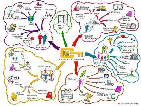 Akademiestudie 2005: diese Studie zeigt, für wie entscheidungsfreudig und kompetent sich Führungskräfte halten. Entscheidungen zu treffen fällt vielen Befragten offenbar leicht: 78 Prozent der befragten Führungskräfte sind der Meinung, dass sie selbst gut entscheiden können. Sie bewerten Entscheidungsstärke als wichtige Führungskompetenz Abgesehen von der eigenen Person glauben aber fast 40 Prozent, dass deutsche Führungskräfte allgemein eher entscheidungsschwach sind. Am Entscheidungsspielraum kann das jedoch nicht liegen. Den bezeichnet eine Mehrheit als angemessen. Fast 90 Prozent der befragten Manager glauben auch, dass ihnen immer die notwendigen Informationen zur Verfügung stehen Auf die Intuition oder das Bauchgefühl verlassen sich aber nur wenige gerade mal jeder fünfte Manager entscheidet nach eigenem Bekunden überwiegend aus dem Bauch heraus. Noch weniger geben zu, dass für sie das Gefühl bei Entscheidungen wichtiger ist als der Verstand Eingebunden werden andere jedoch eher zu Beginn der Entscheidungsfindung. Dabei steht das Sammeln unterschiedlicher Meinungen und Bewertungen im Vordergrund. Von Fall zu Fall sind meist verschiedene Personen eingebunden. Das erfordert nach Aussage der Führungskräfte viel Fingerspitzengefühl. Vor allem um nicht Konflikte im Team auszulösen Allerdings halten die befragten Manager die Entscheidungsprozesse in deutschen Unternehmen mehrheitlich für zu komplex. Es gebe einerseits zu viele Personen, die am Entscheidungsprozess beteiligt sind. Weiterhin behindern Macht- und Interessenskonflikte das Entscheiden, so die nahezu einhellige Meinung. Zudem würden die Resultate nicht oder zu wenig kommuniziert. So manche Entscheidung bleibt aber auf dem Weg durch verschiedene Abteilungen und Teams hängen. Verschlungene Pfade durch eine Firma können eine Entscheidung deshalb stoppen. Zudem werden Entscheidungen häufig nur halbherzig getroffen, so die Erfahrung der Manager. Kein Risiko eingehen! Cover your ass! Zur Visualisierung Entscheidungsfindungsinstrumente Um das Team bei dieser Aufgabe zu unterstützen gibt es moderne Entscheidungsfindungsinstrumente, die sowohl die emotionale als auch die rationale Komponente berücksichtigen. Manche Entscheidungen fallen uns leichter, wenn man sie visualisieren kann und damit die emotionale Komponente in uns ansprechen. Ein Hilfsmittel, um mehrstufige Entscheidungsprozesse abzubilden, ist z.B. Entscheidungsbaum Der Entscheidungsbaum ist eine Möglichkeit, ein Entscheidungsproblem darzustellen. Der Entscheidungsbaum dient als Denkhilfe, um verschiedene Optionen mit ihren jeweiligen Konsequenzen darzustellen. Er zeigt also, welche Konsequenzen sich aus Entscheidungen und bestimmten Ereignissen ergeben können. Dabei muss man stark vereinfachen und man kann nur wenige Ereignisse unterbringen. Die Entscheidungsbaum-Methode kann sowohl zur Problemanalyse als auch zur Entscheidungsfindung herangezogen werden. Entscheidungsbäume beginnen mit einem Stamm, an dessen Ende sich eine Verzweigung( Knoten) befindet, die in wiederum verzweigte Äste führt. Bei jedem Knoten wird ein Attribut abgefragt und ein Entscheid getroffen .Die Fragen werden so gestellt, dass alle mit Ja oder Nein beantwortet werden können Diese Prozedur wird so lange fortgesetzt, bis man ein Blatt erreicht. in der Baumkrone( Blättern) liest man dann die verschiedenen Konsequenzen ab, die sich aus den jeweiligen Entscheidungen ergeben. Jeder Endpunkt des Baums ( Blatt) ist daher durch einen eindeutigen Weg erreichbar. Man geht also von einer Ebene zur nächsten und jeder Entscheidung können weitere Elemente wie Ereignisse ,Zustände oder Konsequenzen zugeordnet werden, die man dann mit Symbolen versieht. Der eigentliche Vorteil dieses Modells ist es, dass man einen Überblick vom Problem bekommt und gezwungen ist, das Denken grob zu strukturieren. weiter Infos Mind Mapping Das menschliche Gehirn besitzt eine linke und eine rechte Hälfte. Neuere Forschungen zeigen, dass beide Gehirnhälften jeweils unterschiedliche Funktionen wahrnehmen. Die linke Gehirnhälfte ist bei den meisten von uns für rationales Denken, Logik, Sprache, Zahlen, Linearität und Analyse zuständig, während der rechte Teil überwiegend Raumwahrnehmung, Phantasie, Farbe, Rhythmus, Gestalt, Musterkennung und Dimensionalität steuert. Von dieser Erkenntnis ausgehend vermarktet der Engländer Tony Buzan die Mind-Map-Technik, durch welche gezielt beide Gehirnhälften angesprochen werden sollen. Durch die Nutzung beider Gehirnregionen werden Synergieeffekte genutzt, welche die geistige Leistung deutlich verbessern sollen. Diese Methode ist vor allem für Brainstorming und das Sammeln von Kriterien geeignet und lässt sich mit der Nutzwertanalyse oder dem AHP kombinieren.  Quelle: http://www.creativeeducationfoundation.org/sitemapl Für Mind Mapping benötigt man nur ein Blatt Papier, das im Querformat genutzt wird! In die Mitte der Seite wird ein einprägsames Bild oder eine kleine Skizze gezeichnet, die das zu behandelnde Hauptthema darstellt. Falls eine Zeichnung nicht sinnvoll erscheint, sollte das Schlüsselwort zumindest mit 3D-Effekt in die Blattmitte gesetzt werden. Von dem zentralen Bild ausgehend wird für jeden tiefergehenden Gedanken bzw. Unterpunkt eine Linie gezeichnet. Auf diese Linien werden nur die einzelnen Schüsselworte in Druckbuchstaben zu den Unterpunkten geschrieben. Es sollten unterschiedliche Farben verwenden werden. Man kann so die Übersichtlichkeit erhöhen und zusammengehörende Gedanken durch gleiche Farben kennzeichnen. Symbole, wie Pfeile, Figuren, Bilder, Ausrufe- oder Fragezeichen sollten so oft wie möglich verwendet werden. weiter Infos Vorteile Das Hauptthema beziehungsweise die Grundidee wird zentral angeordnet und kann somit schnell erfaßt werden. Ein kurzer Blick auf eine Mind Map genügt, um festzustellen, worum es geht. Die graphische Darstellung unterstützt beim Denken Eine Mind Map offenbart Lücken. Aufgrund der graph