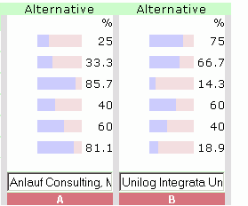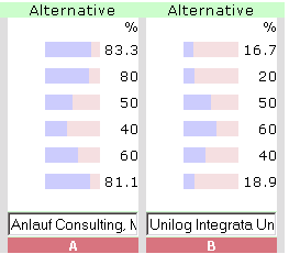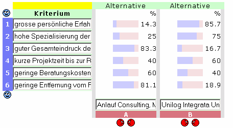 | Theorie Die Globaliserung unserer Welt stellt uns täglich vor neue Herausforderungen. Täglich müssen Sie dazu "richtige" Entscheidungen treffen. Konträre Meinungen in Ihrem Team und Emotionen gemeinsam auf einen optimalen Nenner bringen und nachvollziehbar kommunizieren. easy-mind ist ein modernes Instrument zur ökonomischen Entscheidungshilfe. easy-mind sammelt alle widersprüchlichen Gesichtspunkte und Lösungsvorschläge und zerlegt eine komplexe Entscheidungssituation in paarweise Vergleiche. Per Schieberegler wird ihre Bewertung damit für die (Mit)Entscheider gravierend vereinfacht und dokumentiert. Aus den Bewertungen errechnet easy-mind den optimalen Lösungsvorschlag (als gemeinsamen Nenner) nach einem Verfahren der modernen Entscheidungstheorie von Thomas Saaty Ziel des AHP innerhalb von Entscheidungen im Team ist es, eine gemeinsame, optimale Lösung zu finden mit minimalem Zeitaufwand bei maximaler Qualität und maximaler Akzeptanz seitens der Team-Mitglieder bei der späteren Umsetzung der Entscheidung. Der AHP ist mehr als nur eine Ergänzung zu unseren Entscheidungen per "Bauch". Er bringt auf jeden Fall einen deutlichen Gewinn an Zeit und Qualität, geistige Klarheit und mit Sicherheit das Problem "auf den Punkt". Leider fehlen in der breiten Masse unserer Bevölkerung die elementaren Grundkenntnisse über geeignete Wege und Instrumente zur öknomischen Entscheidungsfindung. Vor allem in Gruppen-Prozessen erspart easy-mind als Instrument enorm viel Zeit und Energie. Dazu sammelt easy-mind alle geistigen Inputs als "Puzzlestücke" der einzelnen Team-Mitglieder, multipliziert diese sehr schnell über das Internet und setzt Sie zur Vorbereitung und gegenseitigen Abstimmung einer Team-Entscheidung als gemeinsames Output zusammen. Dies ist besonder wichtig, wenn ein schnelles aber qualitativ wirklich gutes Ergebnis einer Entscheidung gefordert wird. Software easy-mind Beschreibung der Plattform easy-mind . Dank der webserver-basierende Applikation (PHP + MySql) bieten wir neben den Online-Accounts der Internet-Lösung im Wege des Micro-Payments auch pauschale Lizenzen für die Nutzung innerhalb einer Intranet-Lösung (LAN/WAN) an. Mit easy-mind Entscheidungen per Computer leicht gemacht Demo-Version http://demo.easy-mind.de Voll-Version mit Beispielen in "Rubrik Favoriten" http://decide.easy-mind.de Schulungs-Modell Szenario [einleitender Vortrag zum Szenario] Der Chef einer Ingolstädter Automobil-Zulieferfirma hat schlaflose Nächte. Er merkt, daß die Produktion seiner Türschlösser zunehmend weniger wettbewerbsfähig ist, u.a. weil die Durchlaufzeit pro Türschloss im Fertigungsprozess zu lang ist. Er grübelt darüber nach, welchen externen Unternehmensberater er mit dem Reengineering der Fertigung beauftragen soll. Er bespricht sich mit seinem Projektleiter, um mit ihm zu entscheiden, welche Firma den Beratungsauftrag erhalten, Der Projektleiter - ein Nicht-Bayer - schlägt die Unilog Integrata Unternehmensberatung aus Frankfurt vor, weil er deren Geschäftsführer u.a. auch ein guter "Spezi" aus Studienzeiten von ihm ist. Er rät dem Chef zugleich, auch den Betriebsleiter zu Rate zu ziehen. Der Betriebsleiter erinnert sich an eine andere Beratungsfirma Anlauf Consulting aus München aus seiner Zeit bei seinem früheren Arbeitgeber. Er plädiert als bodenständiger Bayer aufgrund seiner guten Erfahrungen mit dem damaligen persönlichen Berater dieser Firma - auch ein Bayer - für den "Katzensprung" nach München. Das Tagesgeschäft lässt allen Beteiligten nicht viel Zeit und Raum zur Diskussion, welcher Unternehmensberater für ihren Fall jetzt wohl der "richtige" ist. Vor allem der Chef verlässt sich bei seinen Projektleiter darauf, daß er wohl die richtige Auswahl treffen wird. Er verlangt jedoch von ihm, daß dieser nach Angebotseinholung eine nachvollziehbare Darstellung der favorisierten Entscheidung ihm vorlegt, bevor er den Zuschlag erteilt. Der Projektleiter notiert sich sofort auf einem Zettel schon mal die wichtigsten Gesichtspunkte, welche seiner Meinung nach eine wichtige Rolle bei der Auswahl des Unternehmensberaters sollten. - Erfahrung